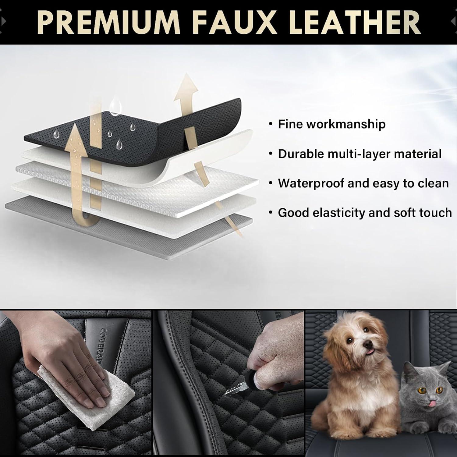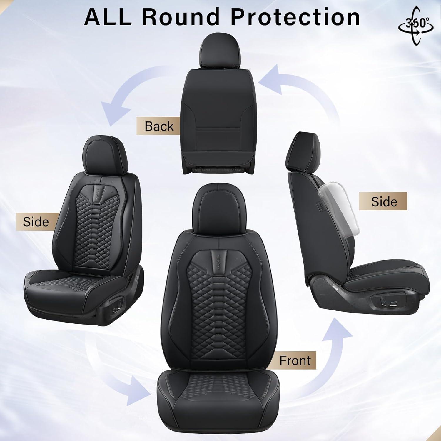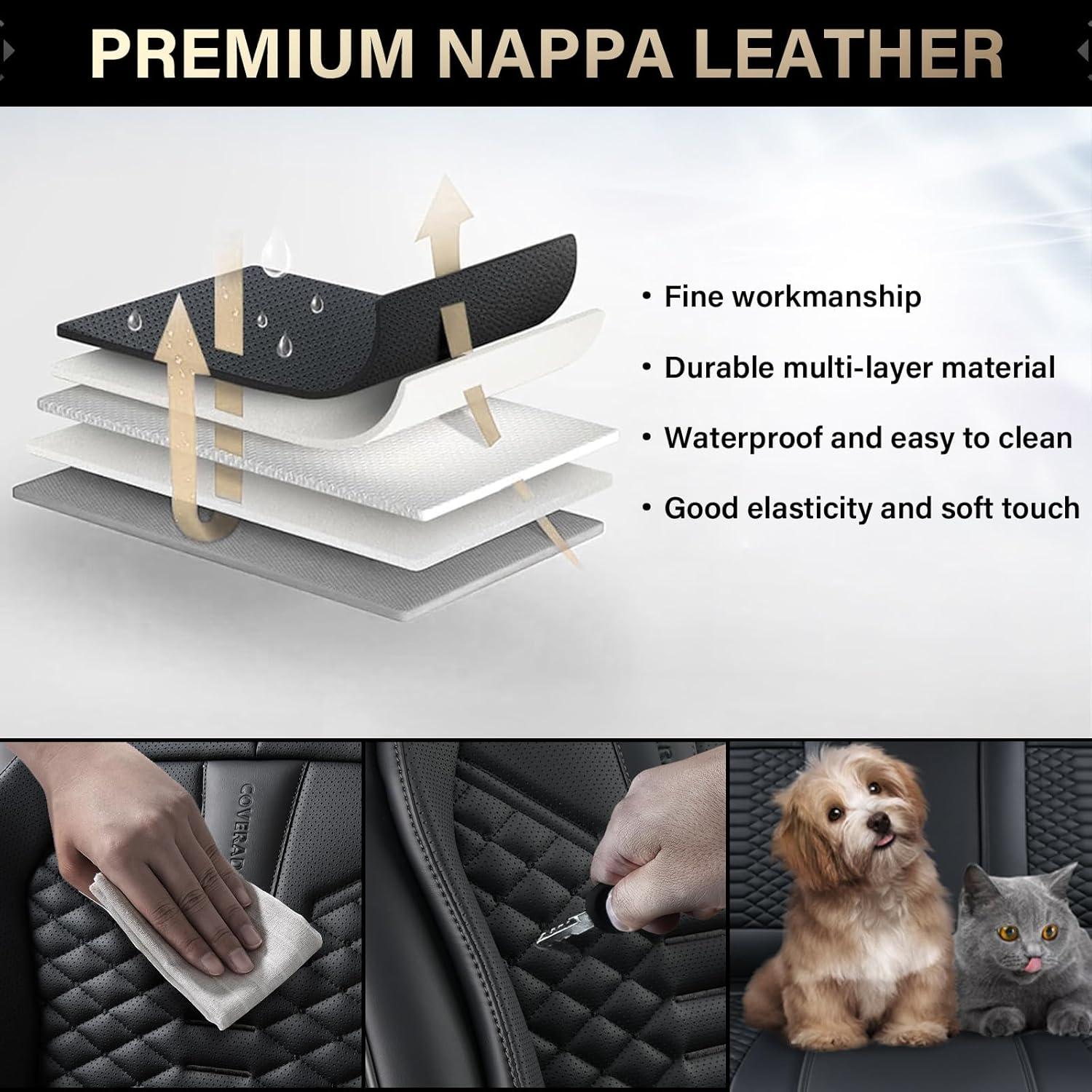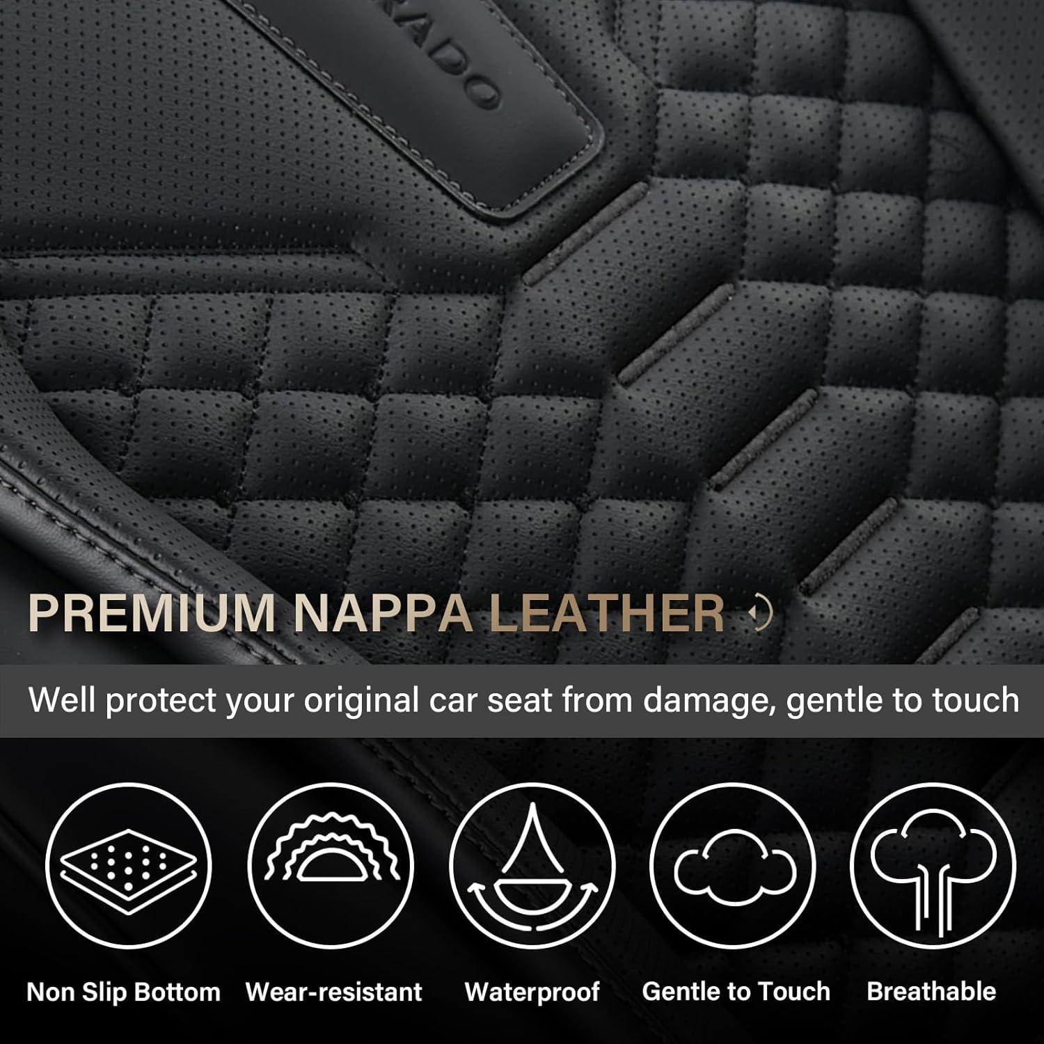 SUPERIOR PROTECTION: Car seat covers are crafted from premium NAPPA Leather and durable leatherette, they are resistant to fading, gentle to touch, waterproof, breathable and made for years to come. The seat covers also filled with high-density soft foam, providing excellent comfort while driving. The fully wrapped side design protects the seats from liquid splashes, stains, pet hair, and harmful UV rays