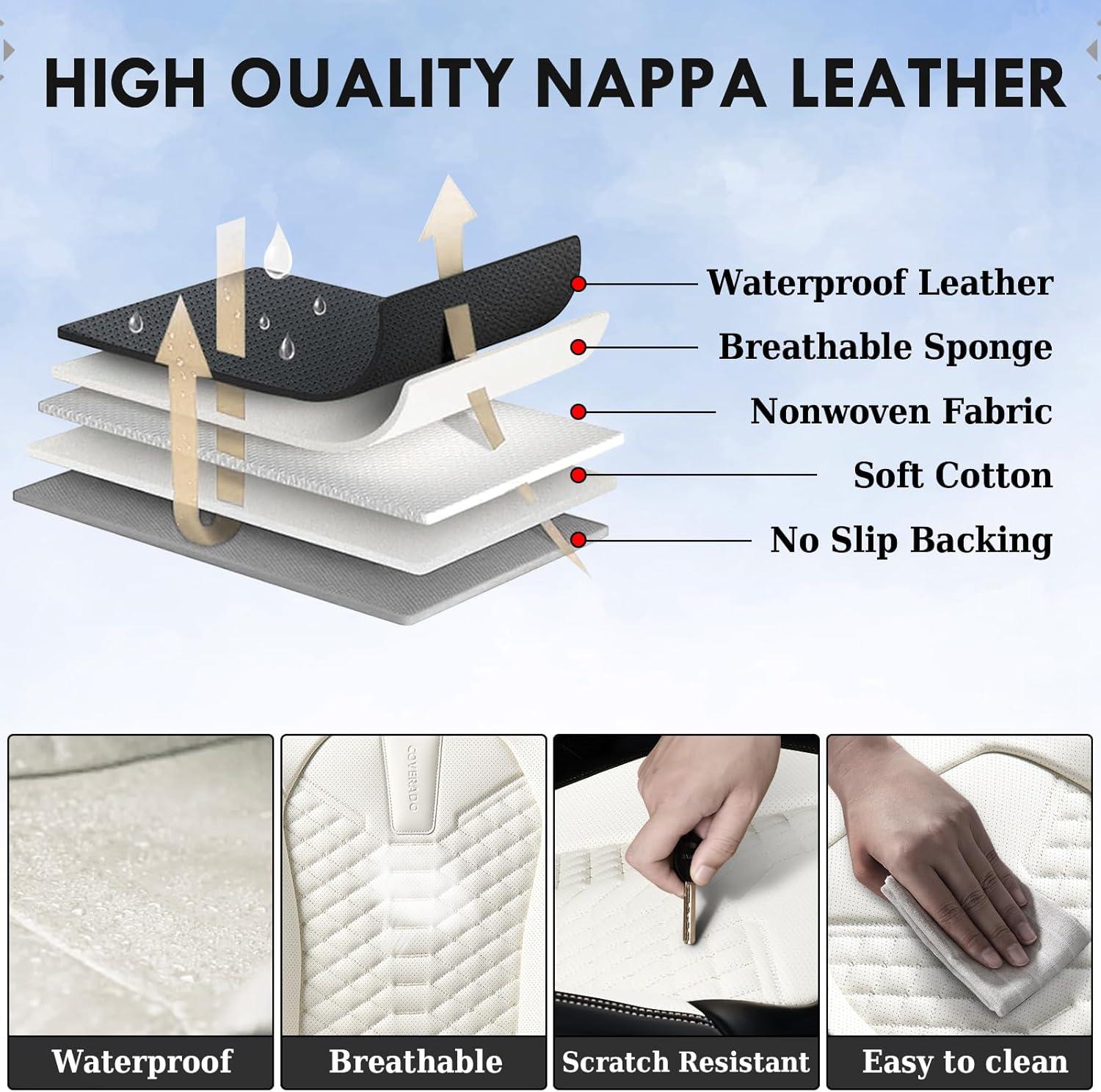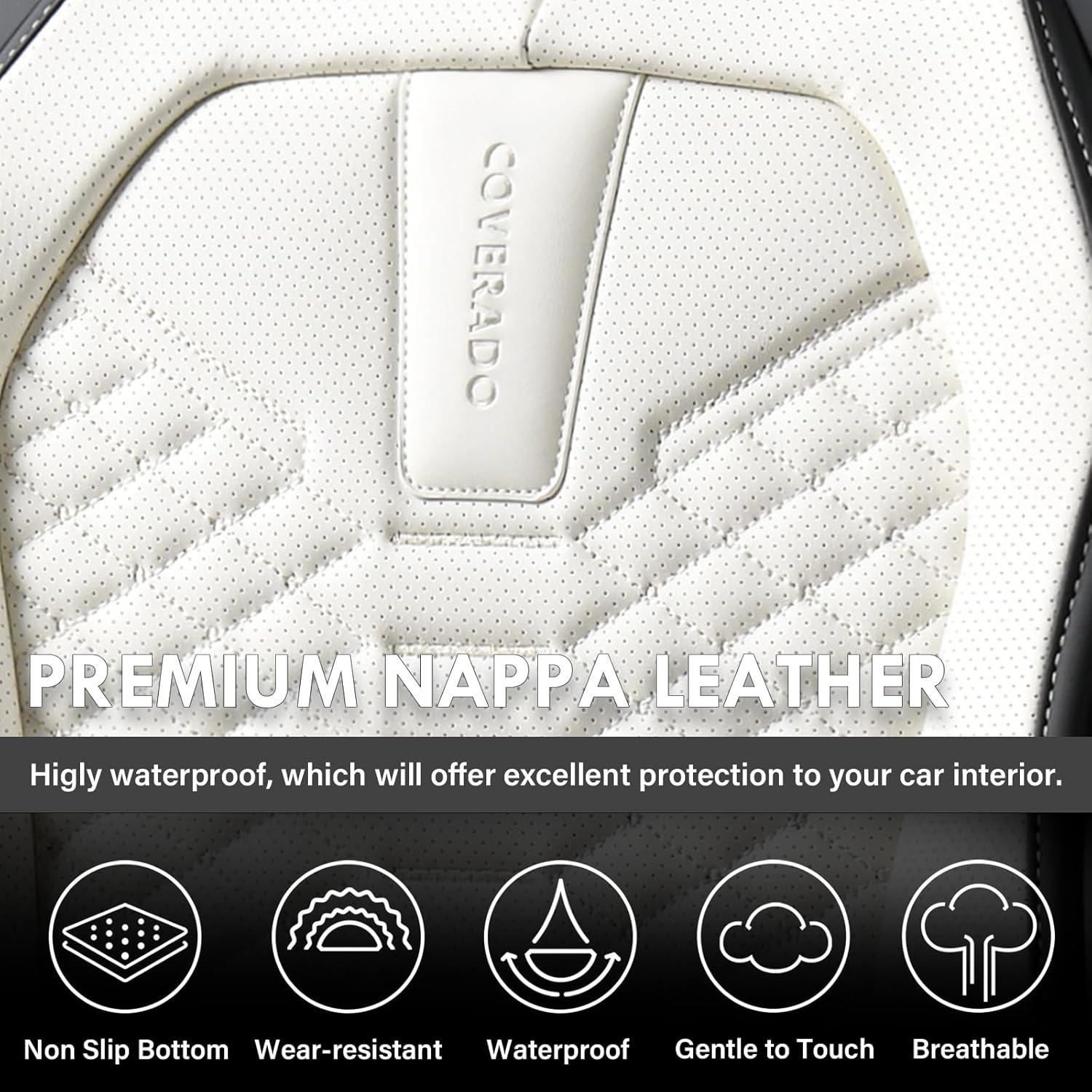 SUPERIOR PROTECTION: Car seat covers are crafted from premium NAPPA Leather and durable leatherette, they are resistant to fading, gentle to touch, waterproof, breathable and made for years to come. The seat covers also filled with high-density soft foam, providing excellent comfort while driving. The fully wrapped side design protects the seats from liquid splashes, stains, pet hair, and harmful UV rays