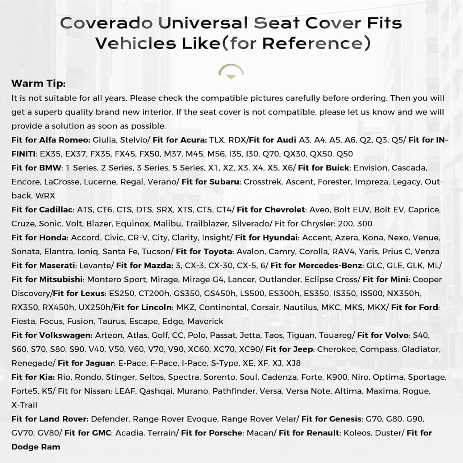 SUPERIOR LEATHER: Coverado car seat cover is made from high quality breathable artificial leather with high density foam padding to upgrade your driving experience. With numerous ventilation holes and good elasticity, this breathable seat cover ensures a skin-friendly and comfortable feel so you can enjoy every journey