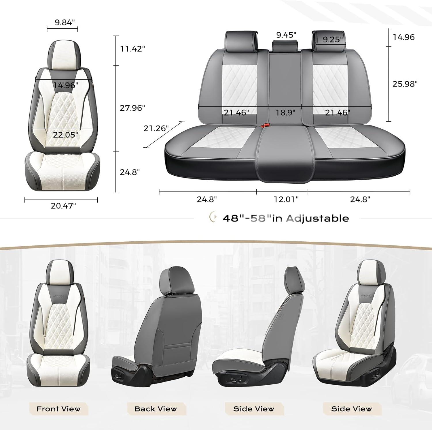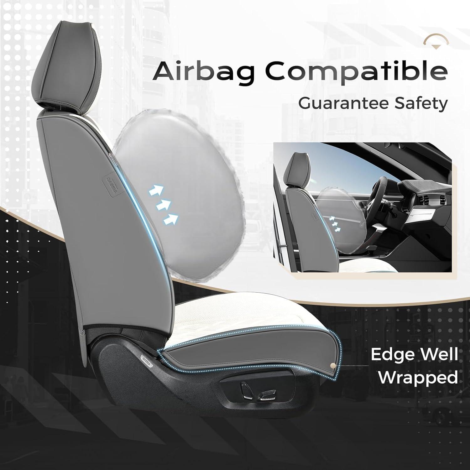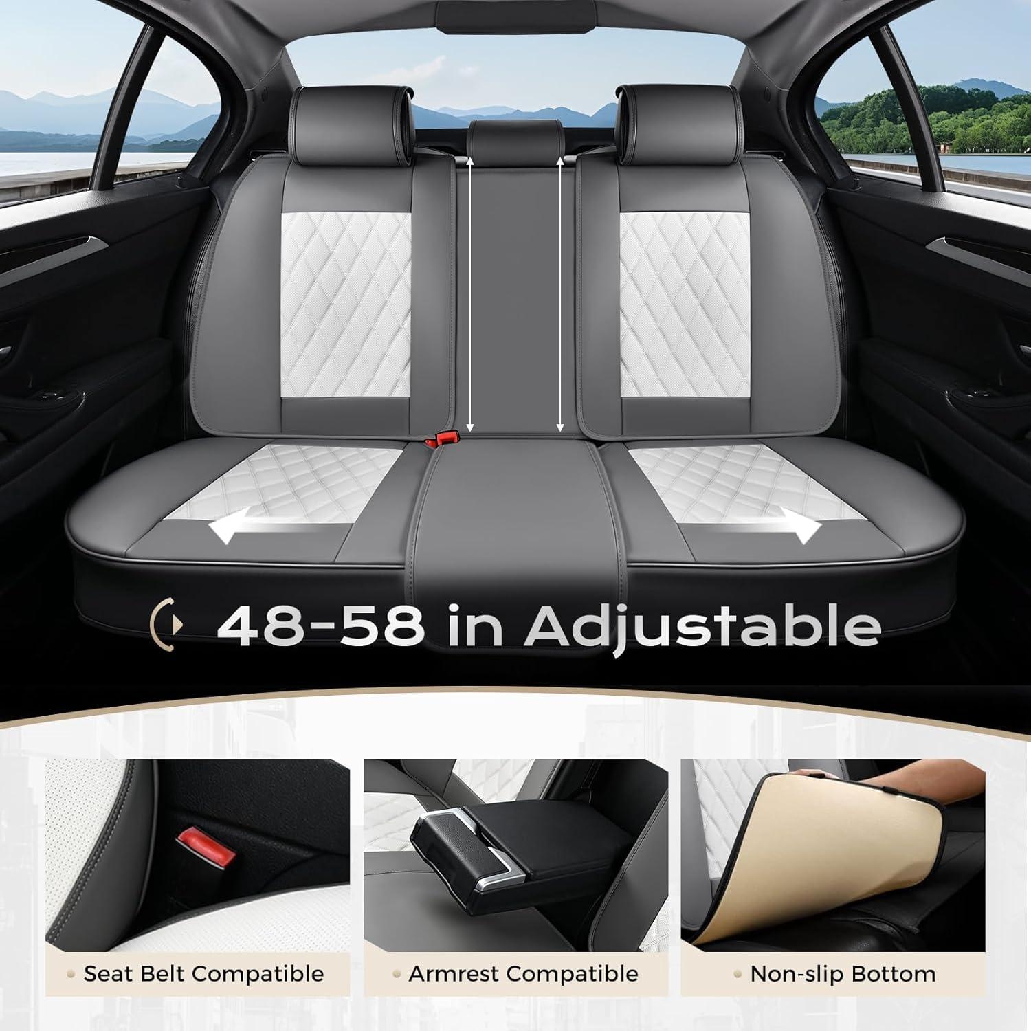【Universal Fit】Our front and back seat covers are tailored to provide a excellent fit for most vehicles such as sedans, trucks, SUVs, and vans. Waterproof car seat covers are compatible with armrests, seatbelts, rear center console, airbag cutouts, and massage, and fit most seats with molded or adjustable headrest. The back seat cover can also be adjustable to fit different seat width. Our seat covers just cover the seat but do not hinder the original functions for optimal comfort and safety