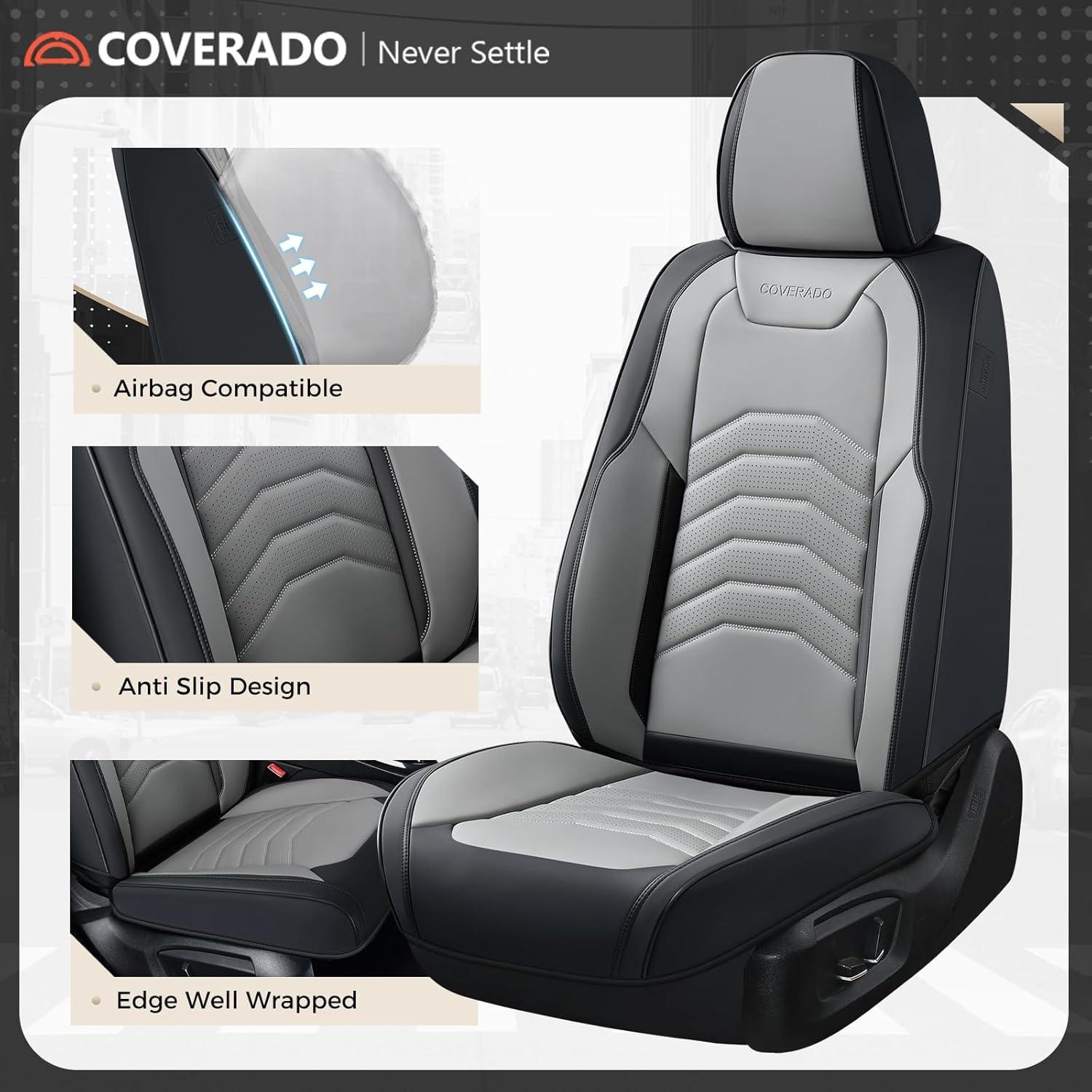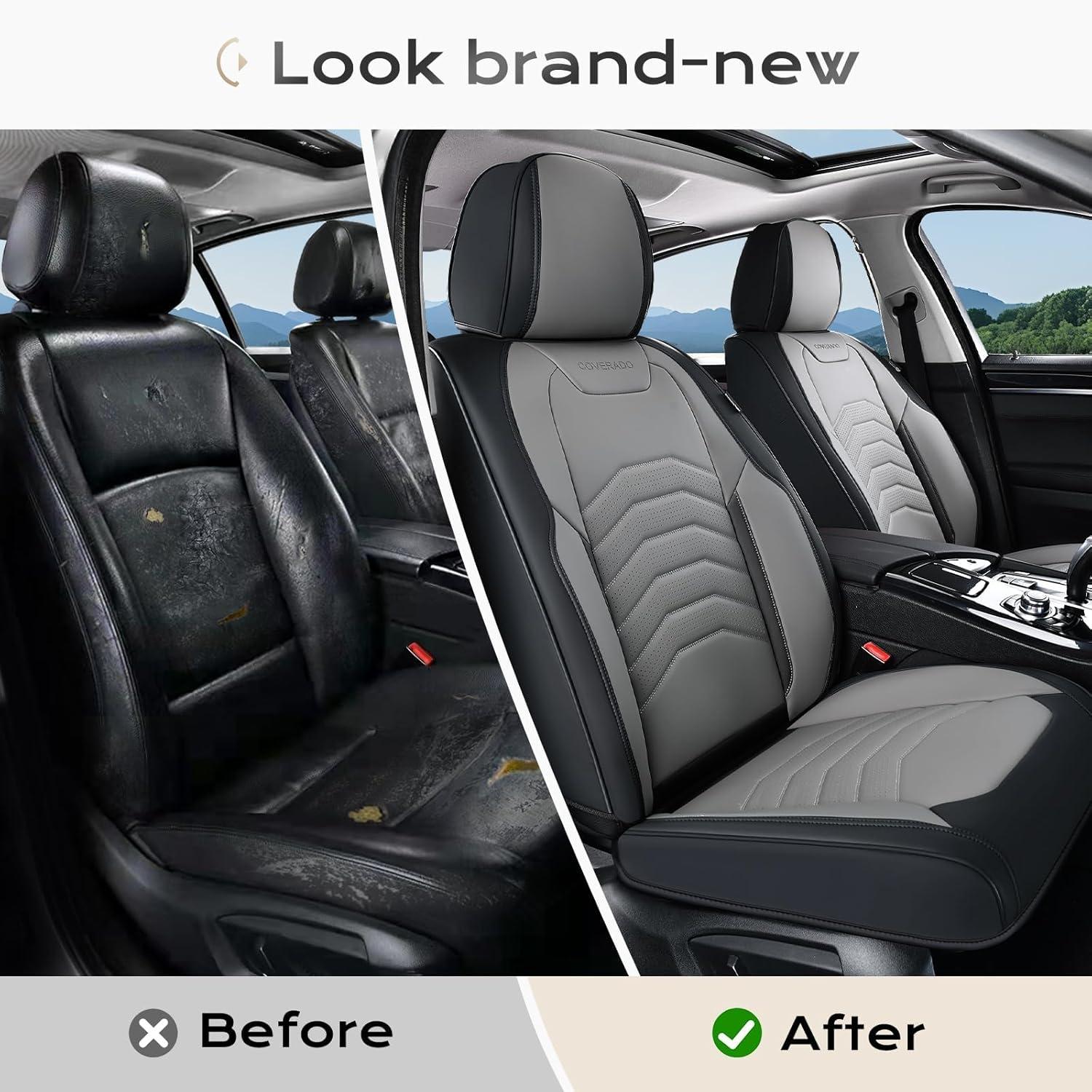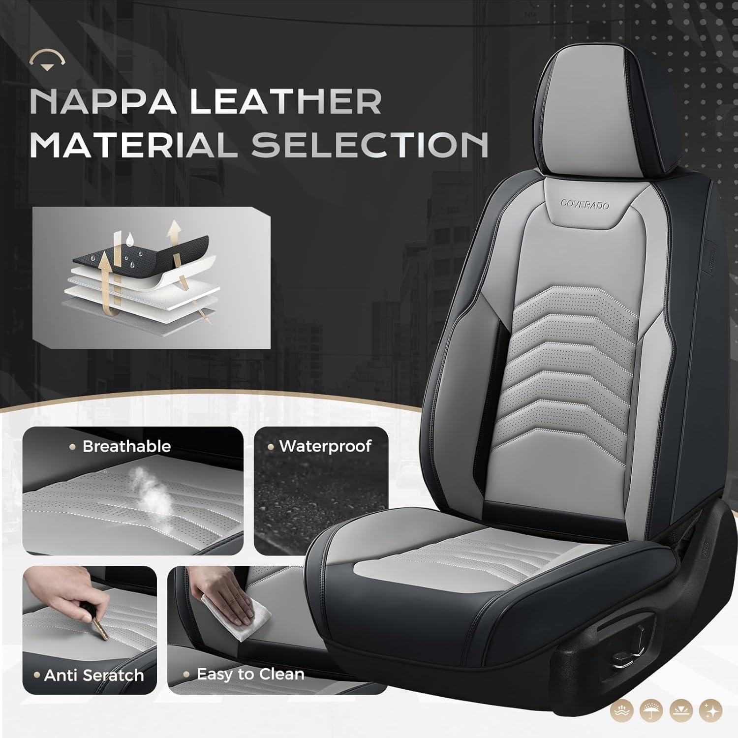 【Preferred Leather】Coverado seat covers is made of perforated Nappa leather and durable faux leather with high resilience density foam padding. The breathable and Waterproof car seat cushion will enhance your comfortable sense of touch and relieve fatigue for your driving. These car seat protectors are stylish and modern, adding a touch of fashion and luxury to your car interior
