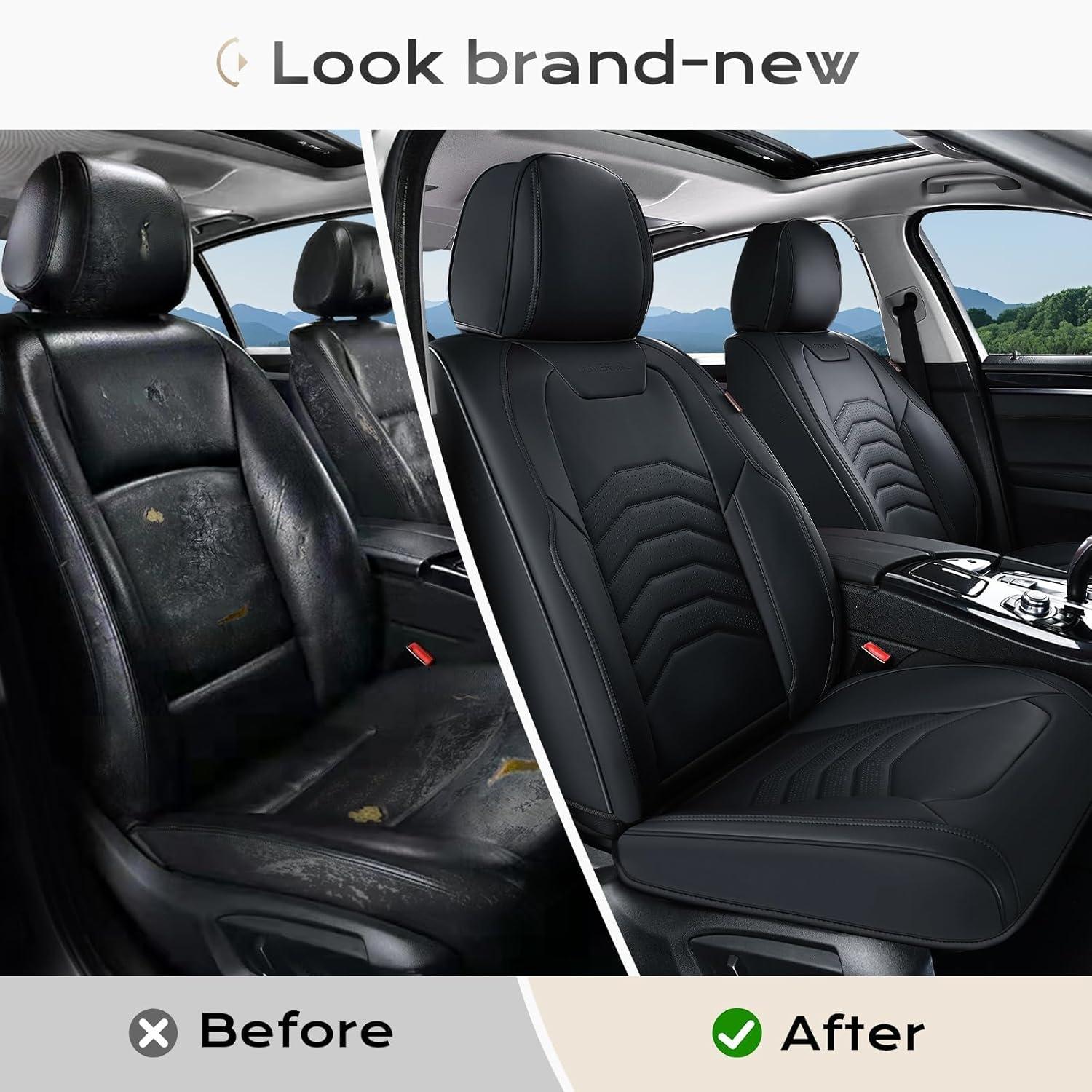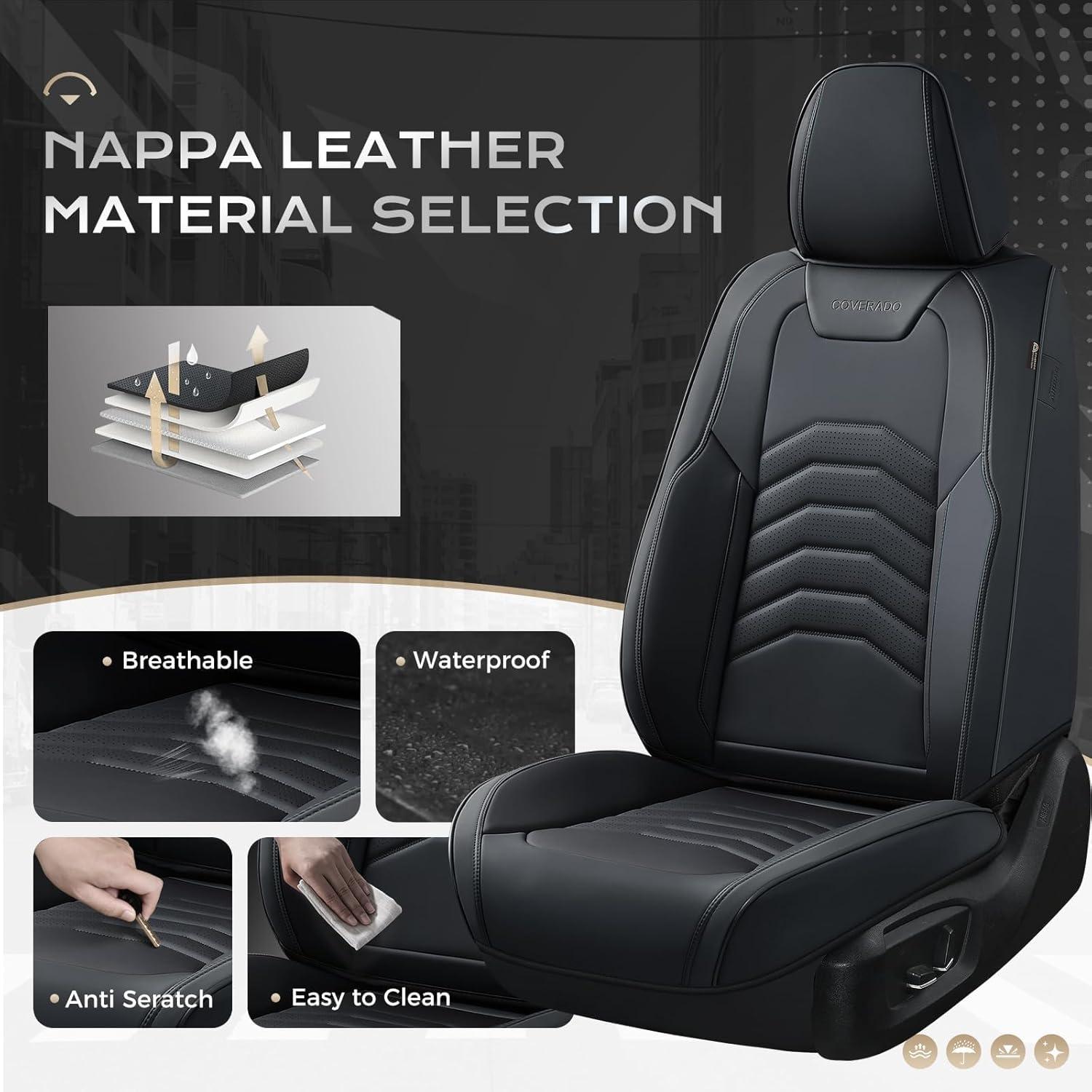 【Preferred Leather】Coverado seat covers is made of perforated Nappa leather and durable faux leather with high resilience density foam padding. The breathable and Waterproof car seat cushion will enhance your comfortable sense of touch and relieve fatigue for your driving. These car seat protectors are stylish and modern, adding a touch of fashion and luxury to your car interior