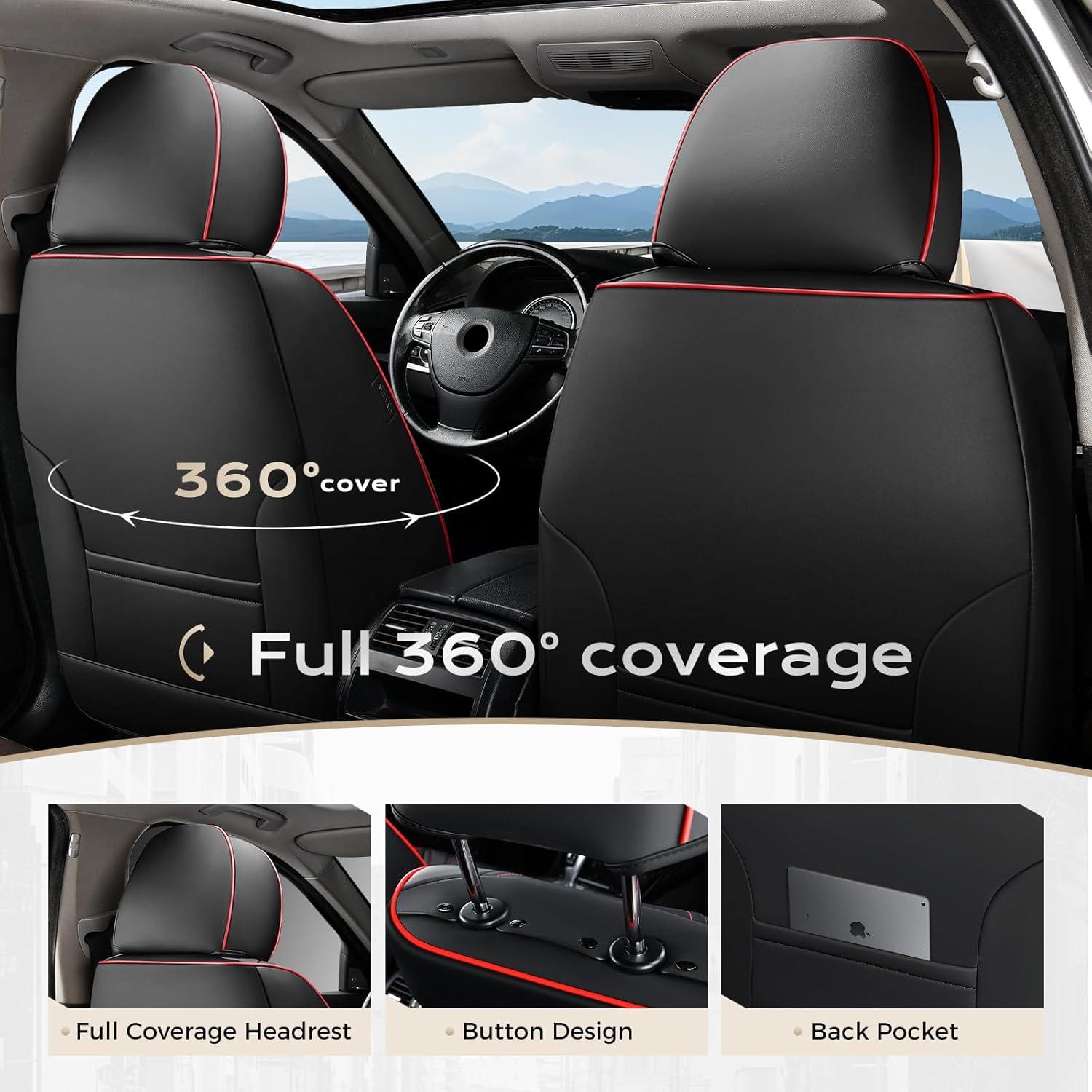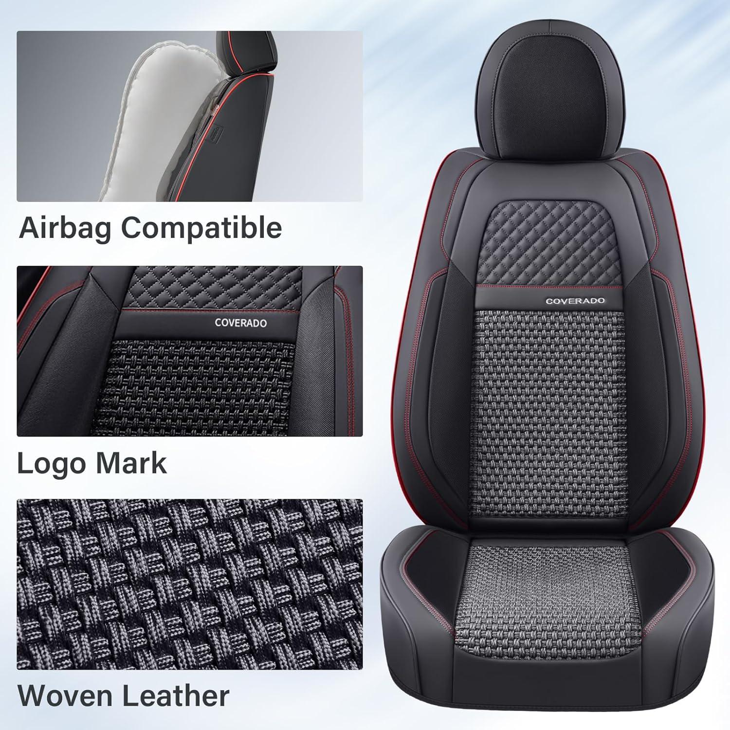 Coverado Leather Front Seat Covers, 2-Pack Universal Waterproof Breathable Leather Woven Leatherette Seat Cushions, Auto Car Seats Protectors, Fit for Most Vehicles-Blackpure(Red Line)