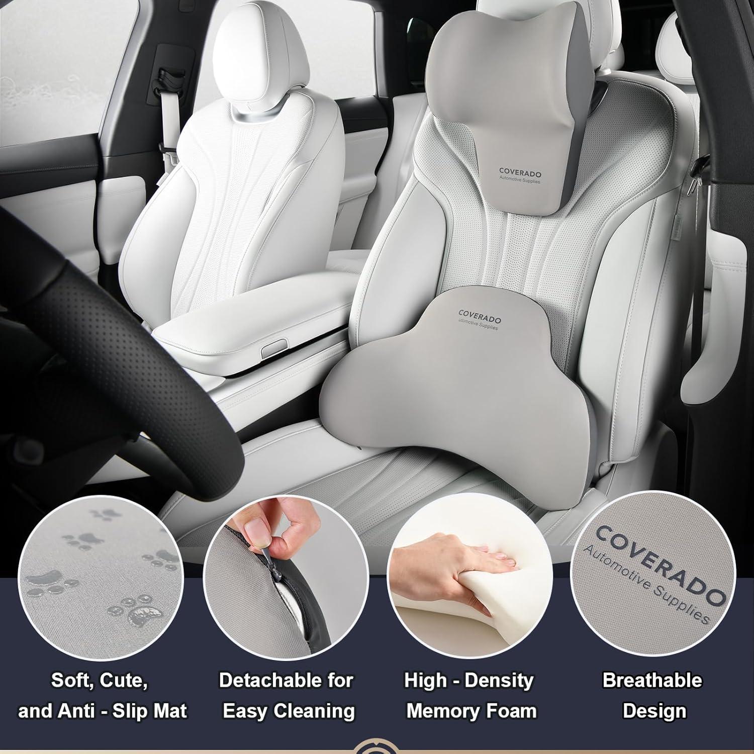 Coverado Seat Cushion and Lumbar Support Pillow One Piece for Car Office Chair, Ergonomic Memory Foam Desk Chair Cushion Back Support Pillow, Sciatica & Back & Tailbone Pain Relief Cushion-Gray(Lumbar Support & Headrest-beige)